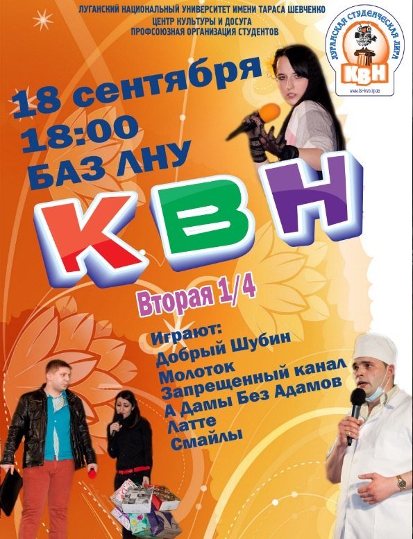 18 сентября 2013 года в 18.00 в Большом актовом зале ЛНУ (2 корпус, 2 этаж) состоится игра второй ¼ финала Луганской студенческой лиги КВН. В состязании примут участие 3 команды из Луганска, а также гости лиги из города Донецка. После летнего перерыва «Сезон охоты», именно так назвали редакторы лиги серию игр 2013 года, ЛСЛ вновь порадует зрителя юмором. В этот раз жюри продолжит отбор команд для участия в полуфинальных играх.