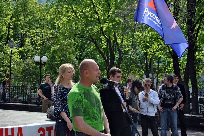На акции было всего два флага – «Луганской гвардии» и синий флаг с надписью «Русский Восток». Выступающий выразил солидарность «мятежному» Славянску, а также попросил народ покричать «Россия».
