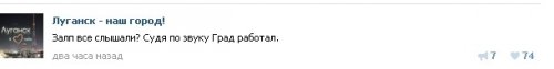 В Луганске местные жители утверждают, что по окраинам города стреляет установка ГРАД 4-07-2014, 22:04 citynews.net.ua | Напечатать Как утвержадют очевидцы, в окрестностях Луганска работает установка ГРАД. Другие новости по теме: Огромный град превратил крыши Старобельска в решето, убил свинью и повредил все огородыВ Луганской области град превратил крыши частных домов в «решето»В Луганске выпал град размером с голубиное яйцоАэродром Краматорска штурмуют 300 террористов с "Градом"В Луганской области град слипался в куски диаметром 4,5см и пробивал дома насквозь