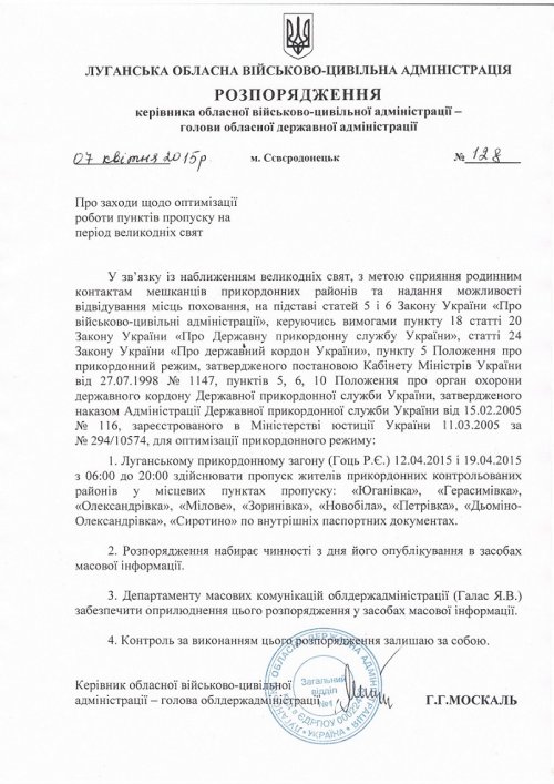 По словам Москаля, распоряжение подписано для облегчения на праздники родственных контактов людей, живущих в приграничных населенных пунктах с обеих сторон государственной границы.