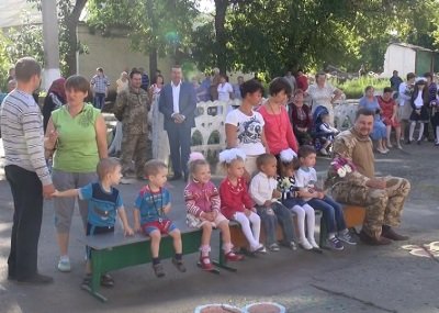 В первый день «перемирия» в Донбассе, в прифронтовом поселке Новотошковское Луганской области состоялся праздник первого звонка в восстановленном после обстрелов учебно-воспитательном комплексе №10.