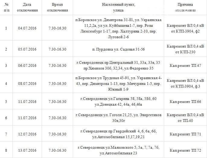 В Северодонецке продолжают отключать свет (график) 24-06-2016, 17:49 citynews.net.ua | Напечатать Северодонецкоий РЭС продолжит плановые отключения электроэнергии в июле. Публикуем график отключений. Другие новости по теме: Веерные отключения в Луганске (график)В Керчи возобновились веерные отключения светаЛуганские энергетики рассказали, в каких случаях могут не запланировано отключать светВ Украине в целях экономии будут отключать электроэнергиюВ Харькове планируют отключать свет только в случае критической нагрузки на электросети