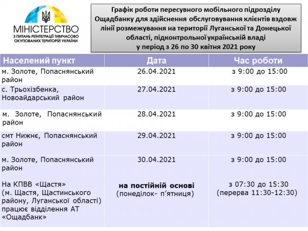 График работы передвижного подразделения «Ощадбанка» в Луганской области на 26-30 апреля: