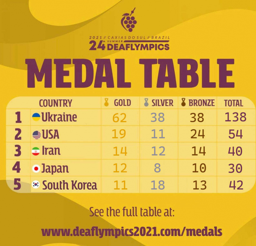 У підсумку Дефлімпіади-2021 в збірної України 138 медалей. Із них 62 золоті, 38 срібних та 38 бронзових.