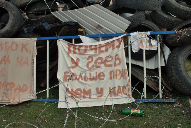 И вот собрался Луганский «майдан» (именно так местные жители уже называют лагерь у СБУ). Там строили баррикады, жгут костры, кормят горячей пищей и поят чаем, молятся, каждый день сочиняют новые плакаты, в которых заверяют всех в своей силе. К примеру, «хунта потеряла Донбасс» или «мы будем решать». Но в толпе господствует одна основная эмоция – и эта эмоция – страх. Страх, граничащий с отчаянием. Словно, люди вышли на улицы и сами испугались происходящего. Отсюда и ненависть к людям с камерами, напускная загадочность, и все эти устрашающие видео, на которых парни с автоматами рассказывают о своей «крутизне» и о том, что «Донбасс уже победил».