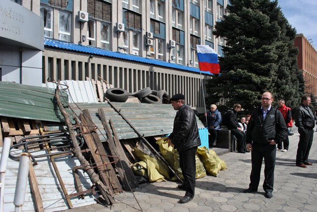 У здания СБУ, с которого сбили надпись и прилепили туда большой орден Отечественной войны, стоит парень и рассказывает о том, что на Майдане в Киеве все стояли за деньги, а они тут – бесплатно. Говорит, что захваченное оружие на улицу они не выносят: