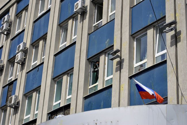 Иногда вздрагиваешь от звука бьющегося стекла – это в потрощенном здании СБУ открывают окна. Оттуда высовывается парень и кричит: «За Донбасс!»
